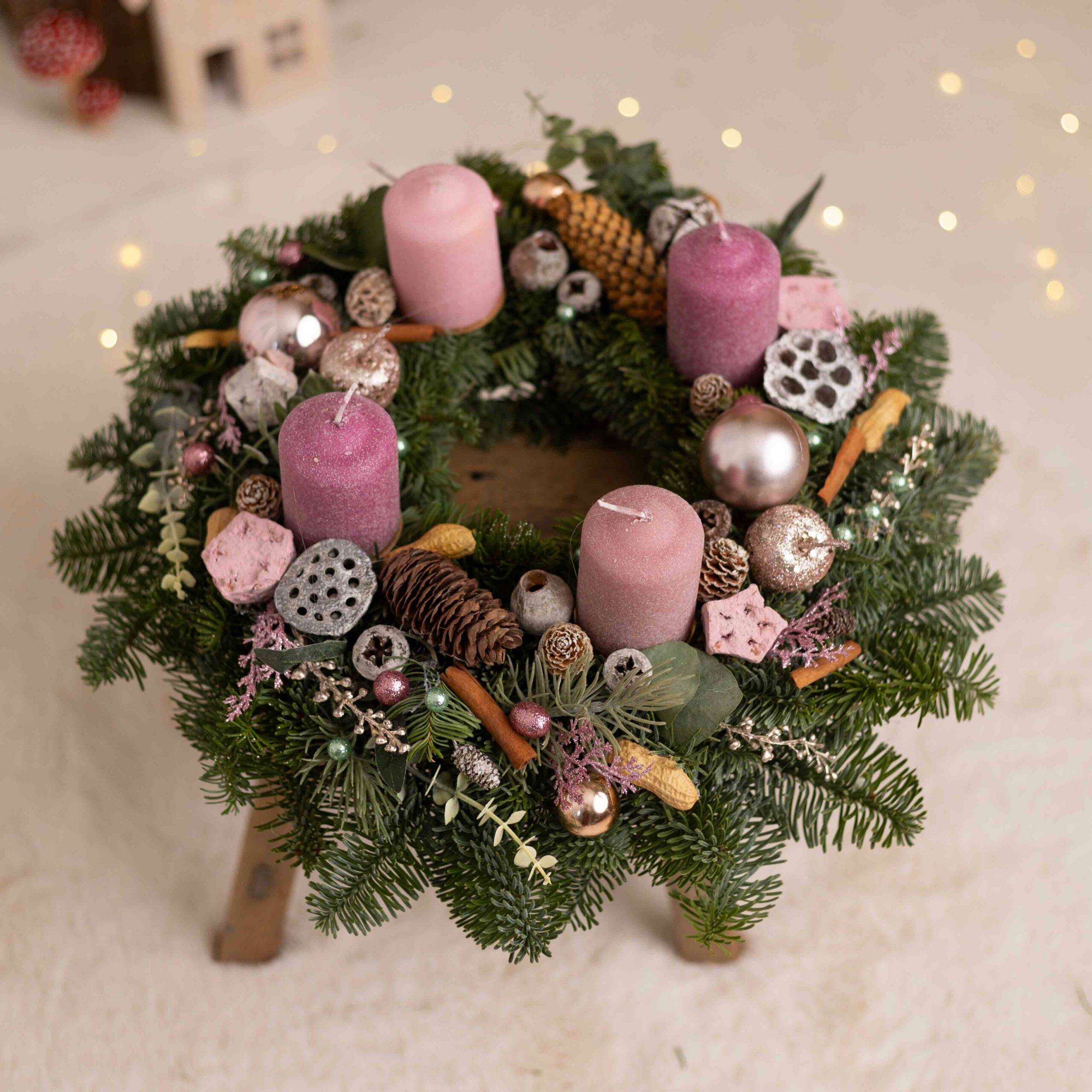 Základom tohto adventného venca je živá čečina ozdobená prírodnými materiálmi a hrubými zlatými sviečkami. Priemer tohto adventného venca je cca 35 - 40 cm.